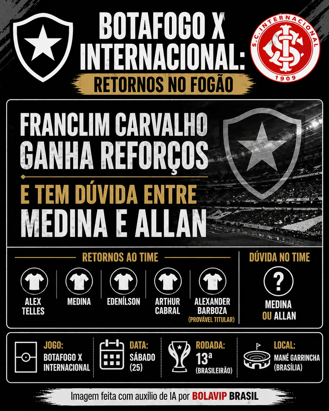 A partida será válida pela 13ª rodada da Série A e pode significar muito para os dois clubes. Em campo, se o Inter vai escalar sua força máxima, o Fogão também vai contar com alguns retornos importantes.