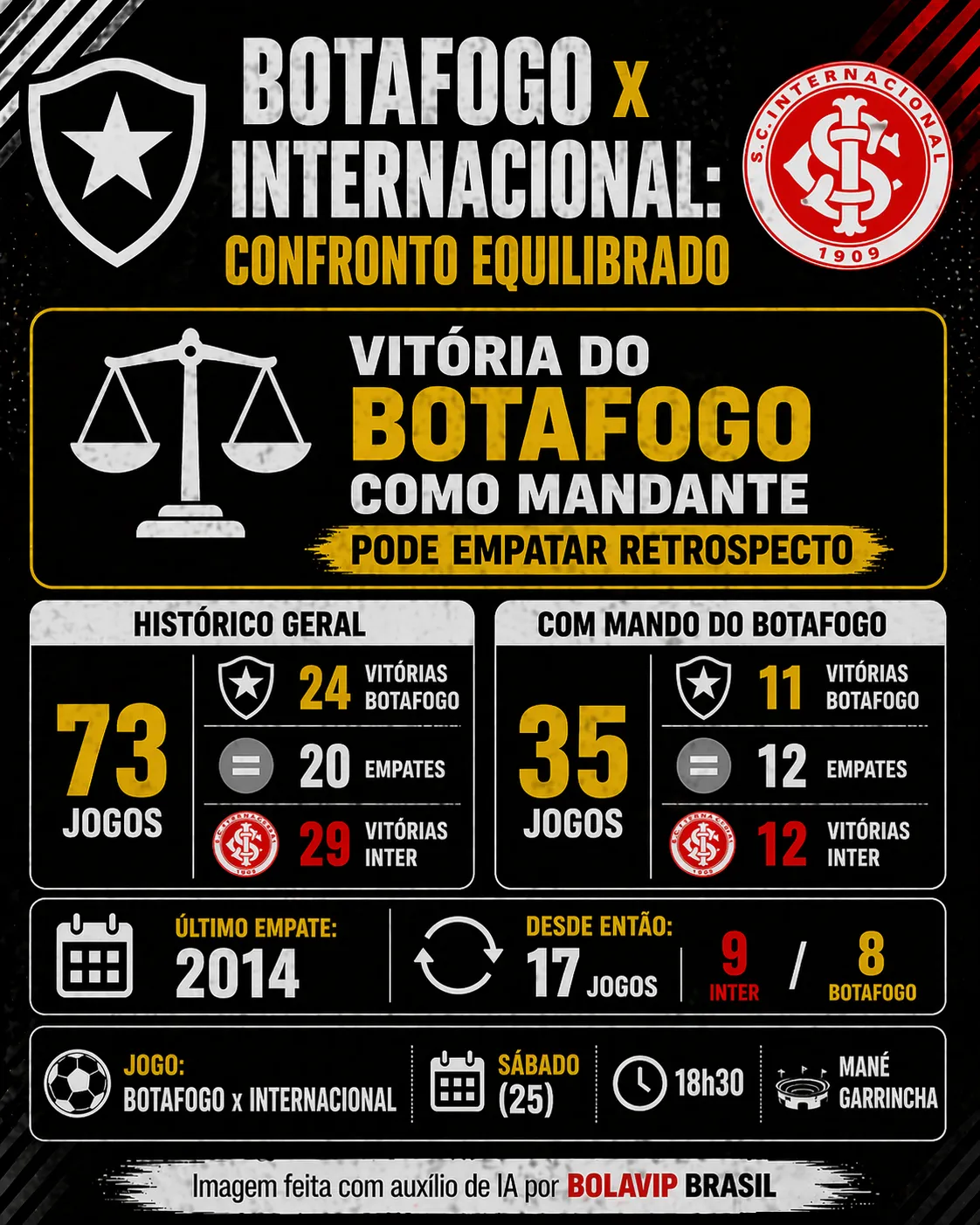 Analisando somente os duelos em que o Fogão era o mandante, são 35 partidas. O equilíbrio é grande, visto que são 11 vitórias do Botafogo, 12 empates e 12 triunfos do Inter de Alan Patrick. Isto é, uma vitória do Glorioso pode empatar o confronto direto.