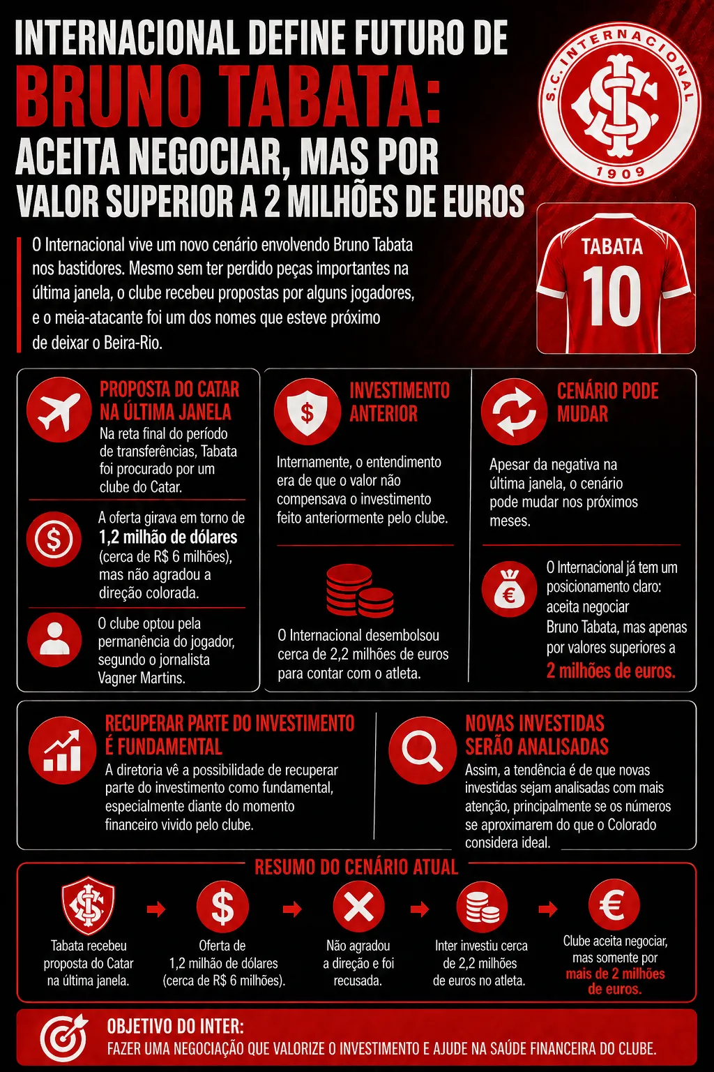 Apesar da negativa na última janela, o cenário pode mudar nos próximos meses. O Internacional já tem um posicionamento claro: aceita negociar Bruno Tabata, mas apenas por valores superiores a 2 milhões de euros.
