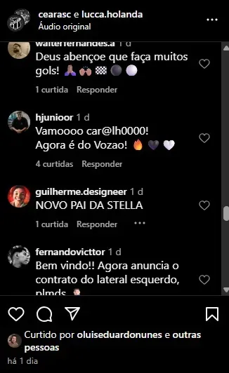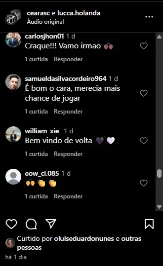 Torcedores alvinegros celebraram o retorno de Lucca com mensagens de carinho nas redes do Vozão: “Seja bem-vindo! Honre o manto!”, escreveu um seguidor. Outros foram mais diretos: “Bem vindo! Pra cima”, “Craque demais”, É bom o cara, merecia mais chance de jogar”.