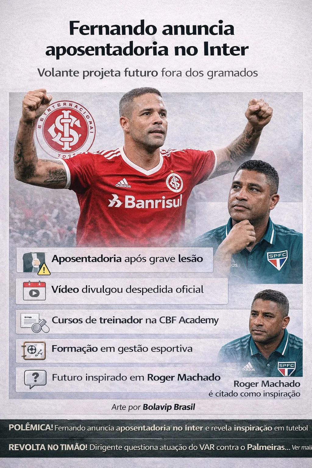 O Internacional teve uma atualização importante nos bastidores no último final de semana. O volante Fernando confirmou oficialmente sua aposentadoria do futebol profissional após um longo período afastado por conta de uma grave lesão no joelho.