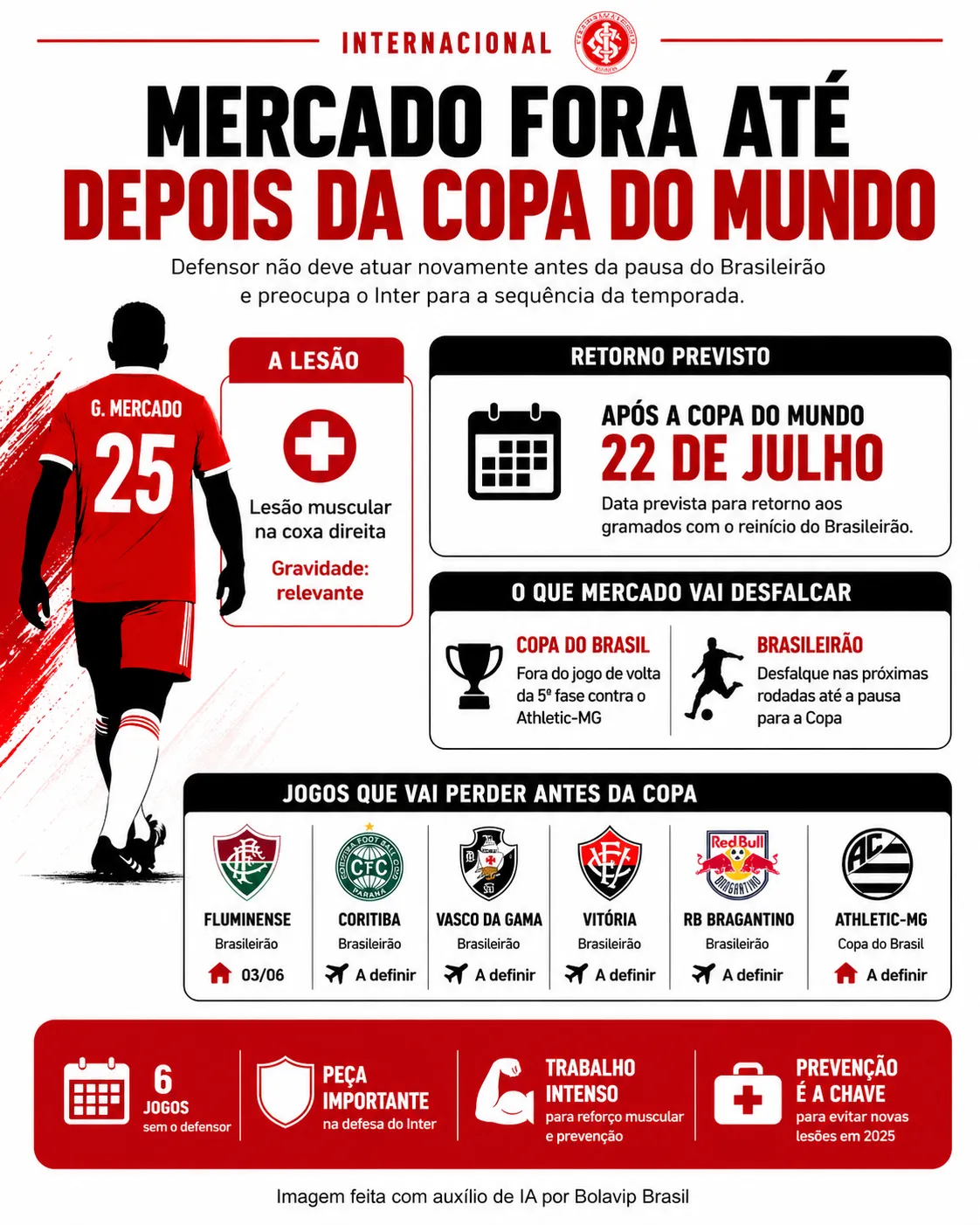 Mercado deve atravessar o calendário sem entrar em campo até a pausa do Campeonato Brasileiro para a Copa do Mundo. No caminho, ficará também de fora de um compromisso relevante: o jogo de volta da quinta fase da Copa do Brasil, contra o Athletic-MG.