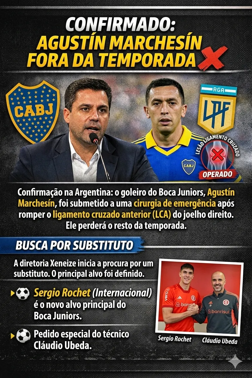 Foi confirmado na Argentina que Agustín Marchesín foi submetido a uma cirurgia após romper o ligamento cruzado do joelho direito, fazendo com que o Boca Juniors passasse a avaliar nomes no mercado da bola para substituí-lo.