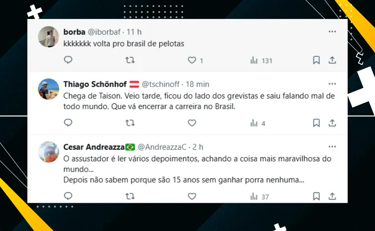 De qualquer maneira, a possível volta de Taison ao Beira-Rio gerou um enorme debate entre torcedores do Inter. Enquanto alguns aprovam o nome, outros não querem mais um veterano no elenco. Veja: