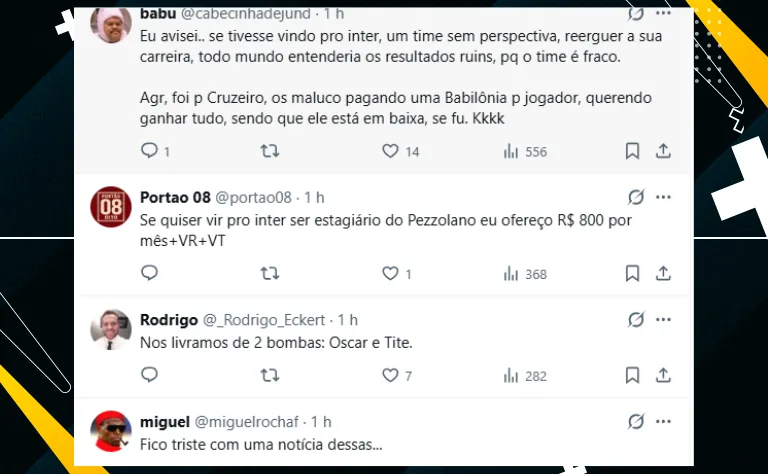 No entanto, a situação é tão ruim que, além de estar virtualmente eliminado no Campeonato Mineiro, vários torcedores querem sua saída. Esse tema chegou até os torcedores do Inter, que resolveram comentar.