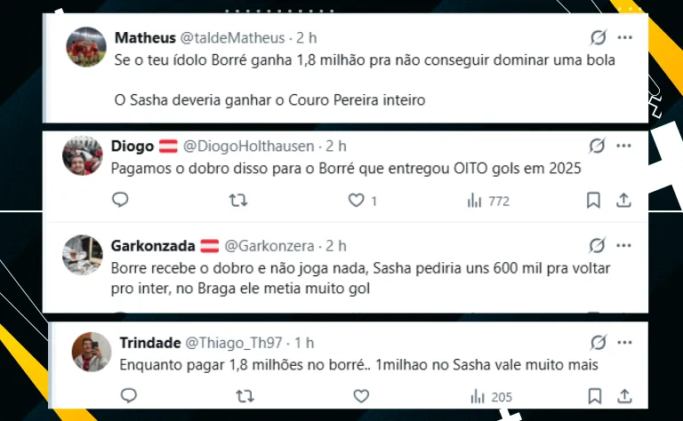 Torcida do Inter repercute salário de Eduardo Sasha e comparação com Borré é exposta