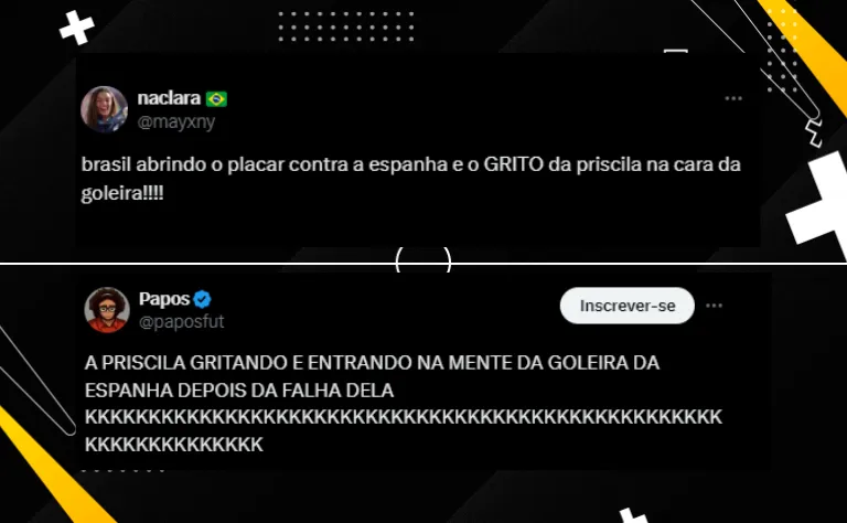 “Que jogo da Priscila! Atitude monstra para uma menina de 19 anos! Pressão no primeiro gol foi dela, sem contar o berro na cara da Cata Cool. Contragolpe do terceiro gol com decisões perfeitas até a bola entrar! Muito agressiva com e sem a bola. Vai ser uma jogadora gigante!”, elogiou um internauta.