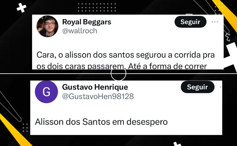 Terminando a frente do brasileiro, Clément criticou o desempenho de Alison na bateria. “Estou muito feliz. Eu terminei em segundo lugar, atrás do Karsten (Warholm). É enorme. Eu queria ir rápido como sempre”, iniciou.