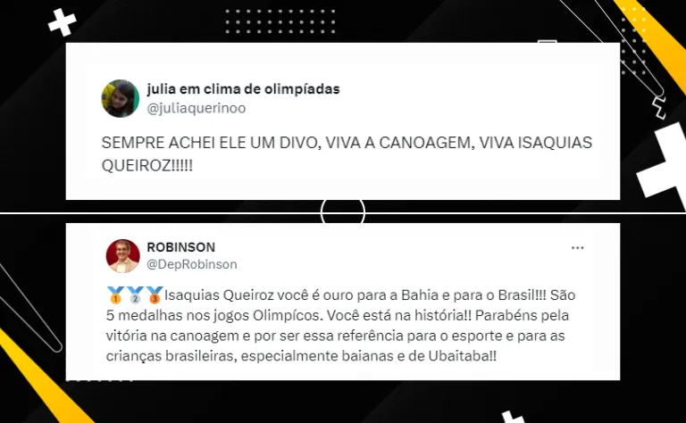 “É uma sensação de alívio, muita felicidade. Não foi um ano fácil para mim. Essa medalha, para mim, é como se eu tivesse sido campeão olímpico. É um peso que tiro das minhas costas […] Chegar aqui e ser prata, ser porta-bandeira do Brasil, representar minha Bahia, meu Brasil, obrigado por todo mundo que acreditou em mim”, disse Isaquias, em entrevista à Globo.