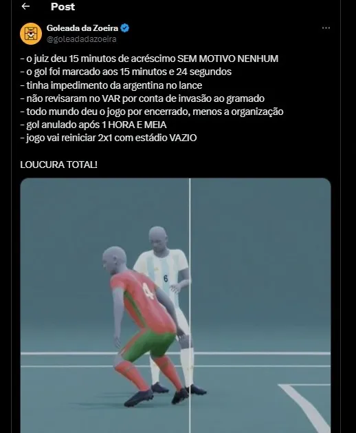“Ele não escutou a opinião dos capitães das seleções que entendiam que o jogo não deveria reiniciar. A Associação de Futebol da Argentina já reclamou com a comissão disciplinar da FIFA para que tomem as medidas pertinentes e se ponha uma sanção aos responsáveis.” finalizou