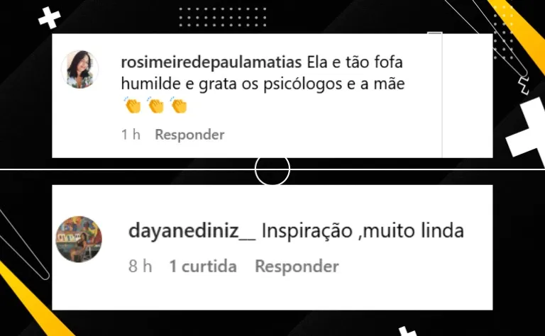Em seguida, a atleta revelou que se inspira na ex-atleta Daianee também na mãe: “Quanto às suas maiores inspirações, na ginástica é Daiane dos Santos, e a pessoa que mais me inspira na vida é minha mãe”.