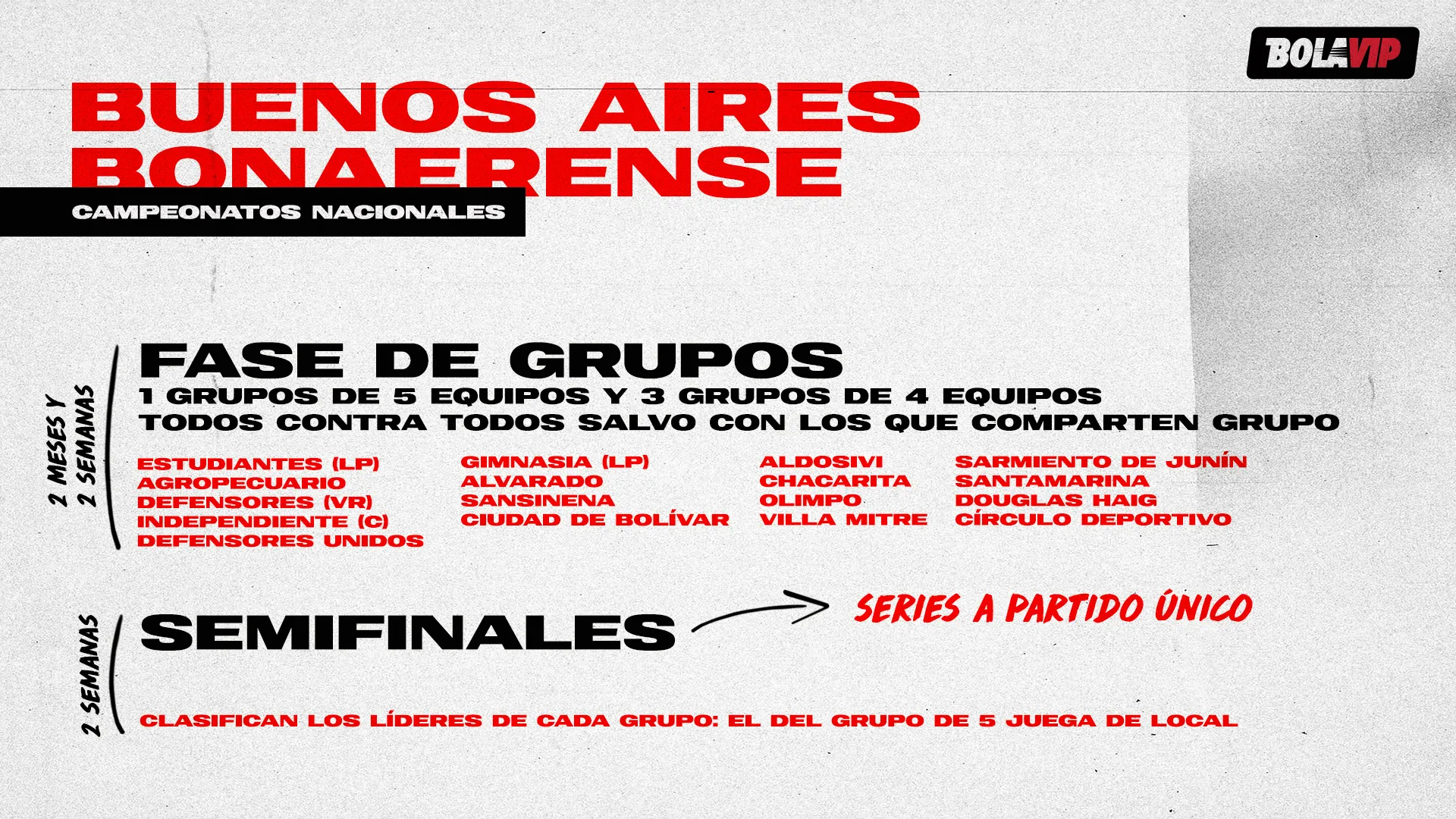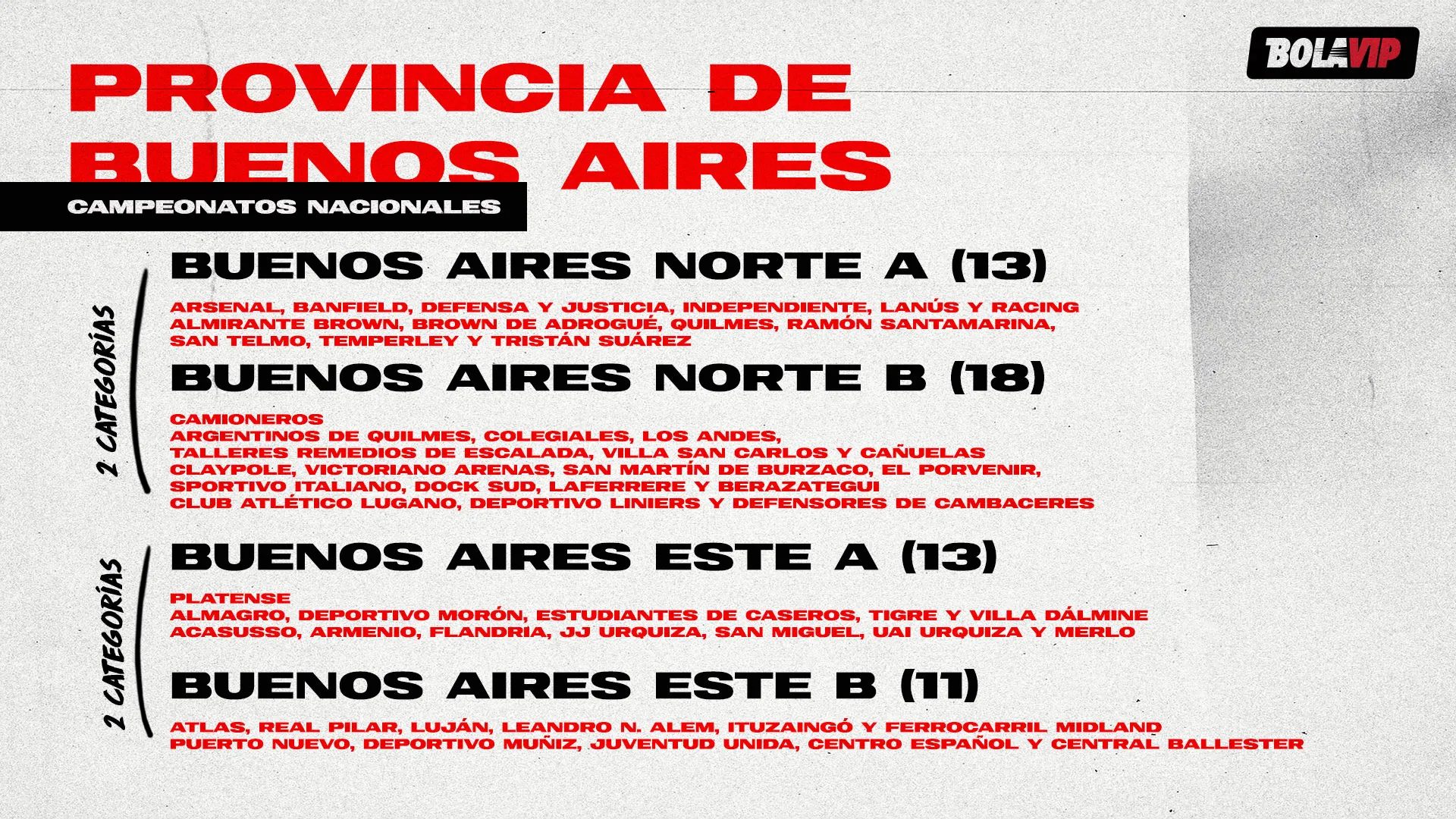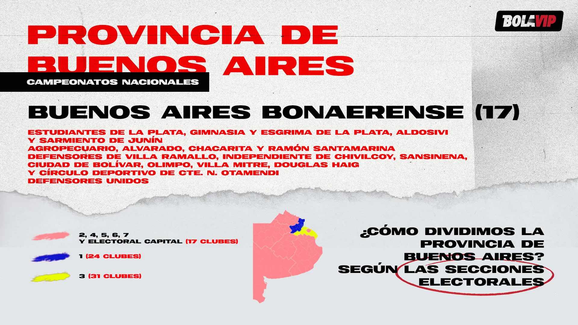 O Provincia de Buenos Aires tem 72 equipes, divididas em oito seções eleitorais: 1, 2, 3, 4, 5, 6, 7 e Eleitorado Capital, que abarcam apenas as equipes de La Plata. O Campeonato Norte teria as 31 equipes de 3, o Campeonato Este as 24 de 1 e o Campeonato Bonaerense os 17 das seções restantes.