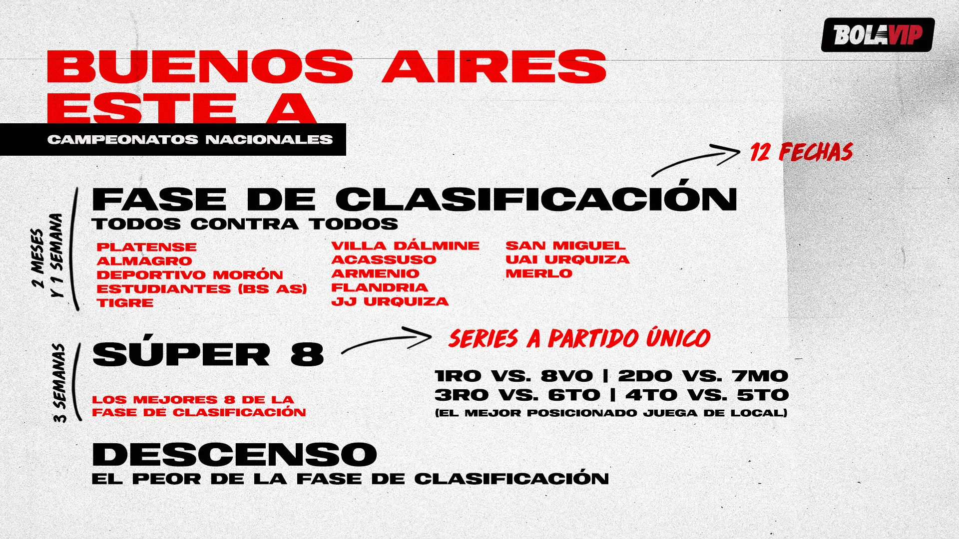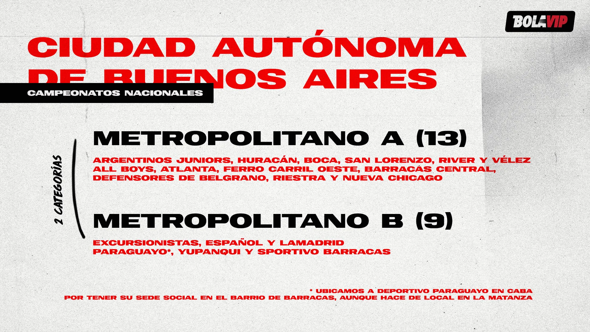 Já no segundo estão os três da terceira divisão (Comunicaciones, Sacachispas e Fénix), os três da quarta divisão (Excursionistas, Espanyol e Lamadrid) e outros três da quarta divisão (Paraguayo, Yupanqui e Sportivo Barracas).