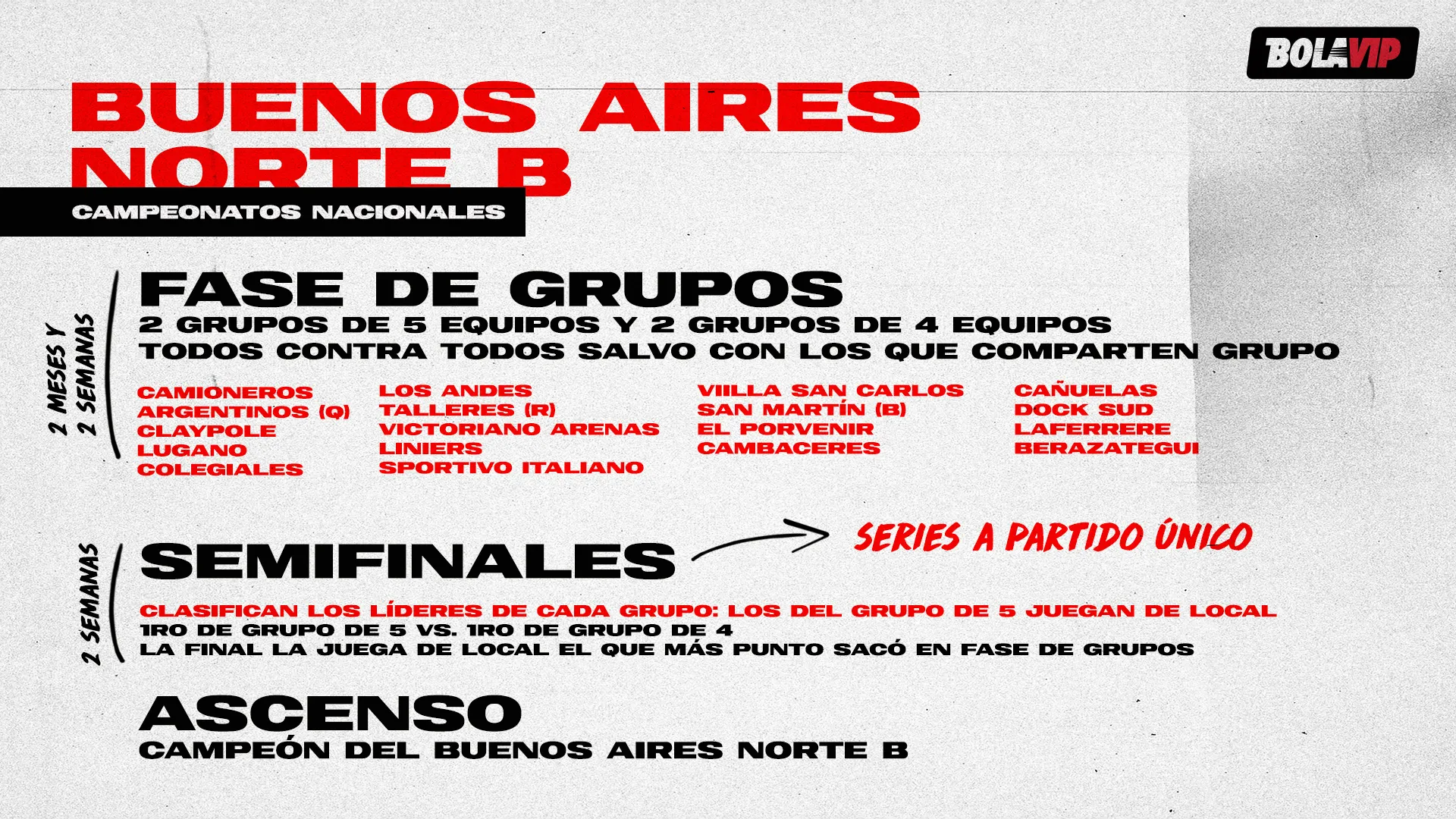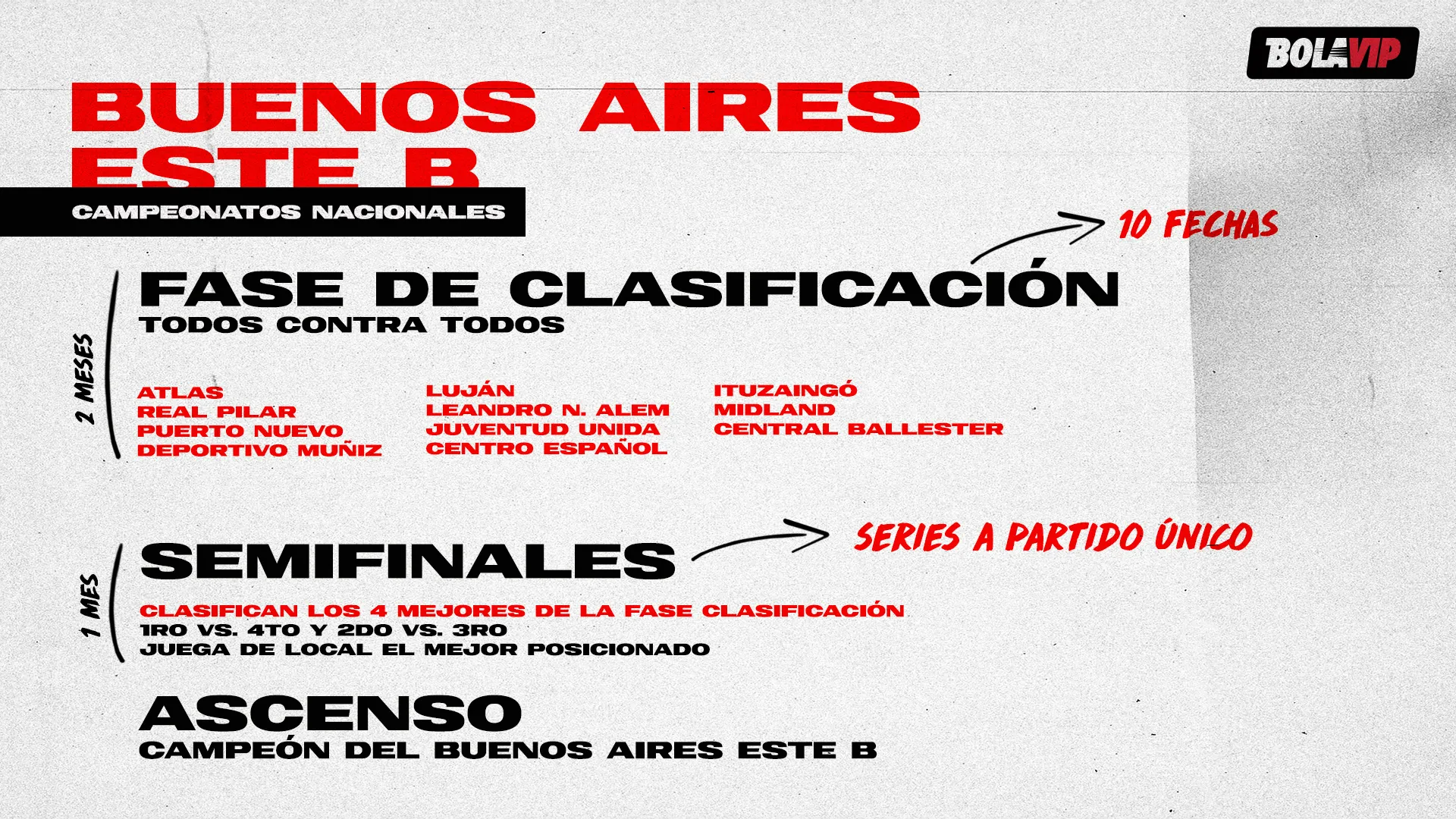 Já no Campeonato Buenos Aires Este B todos se enfrentam em 10 rodadas em 2 meses, até sobrarem quatro, e jogam em casa aquelas equipes que estiverem melhor colocadas. O campeão subiria à divisão superior.