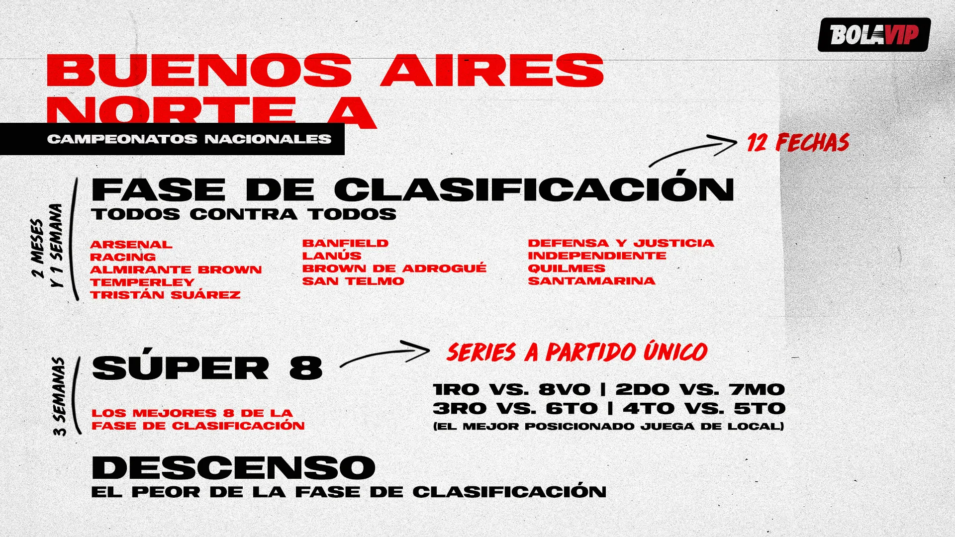 Os 31 clubes são divididos em duas divisões: o Campeonato Buenos Aires Norte A com 13 equipes e o Campeonato Buenos Aires Norte B com 18. No primeiro, estariam: Arsenal de Sarandí, Banfield, Defensa y Justicia, Independiente, Lanús e Racing, da primeira divisão, e Almirante Brown, Brown de Adrogué, Quilmes, Ramón Santamarina, San Telmo, Temperley e Tristán Suárez, da segunda.