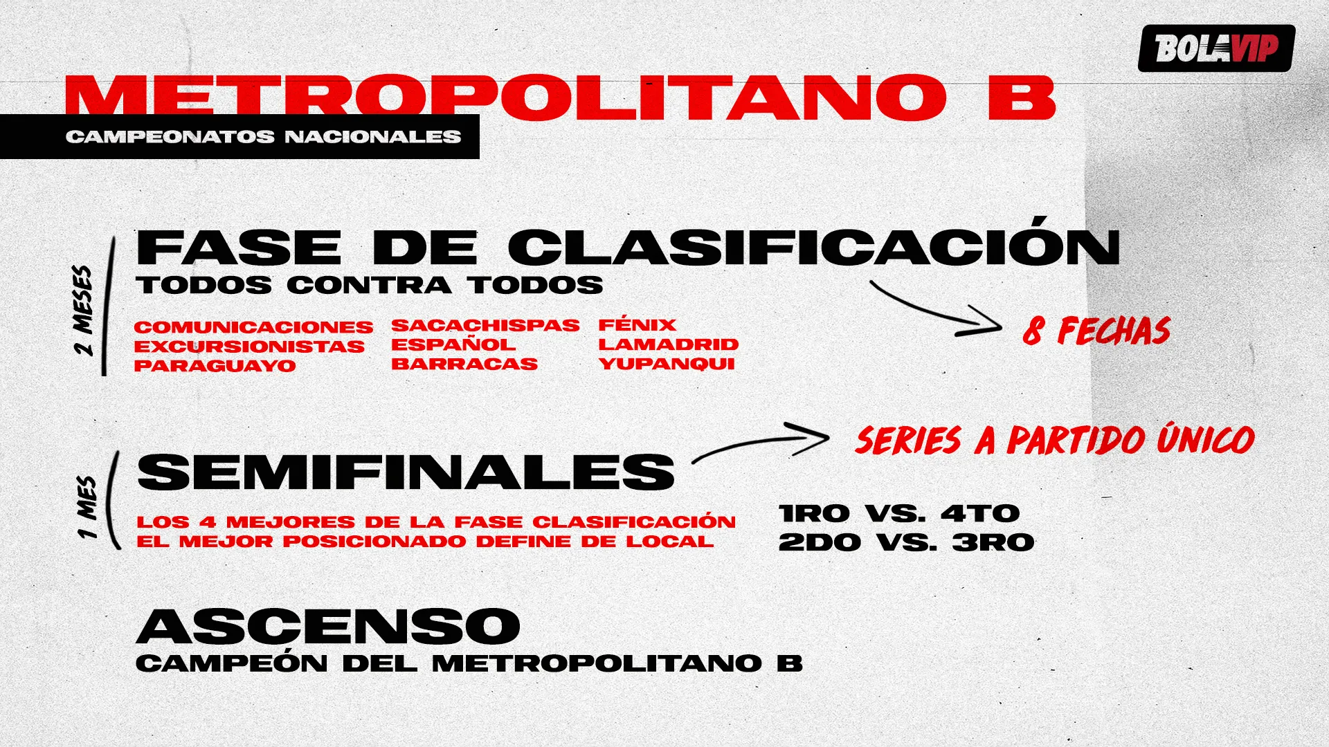 No Metropolitano B, um modelo parecido: todos se enfrentam em um período de mais ou menos dois meses, classificando-se quatro. As semifinais e a final seriam em partidas únicas, com o campeão ascendendo ao Metropolitano A. O objetivo é que, no futuro, 11 equipes estejam em cada divisão.