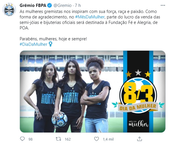 Hoje, dia 8 de março, se comemora o Dia Internacional da Mulher, pensando na igualdade e força das mulheres,clubes brasileiros foram às redes sociais reforçar a mensagem de respeito pelas mulheres em todos os ambientes, principalmente no esporte.