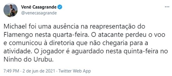 Um atleta que estava ausente das sessões de treinamento foi o atacante Michael. Ele, que tem entrado constantemente nos jogos do Flamengo, perdeu o voo que tinha agendado para o Rio de Janeiro. A origem não foi divulgada. As informações são do jornalista Venê Casagrande, do Jornal O Dia.