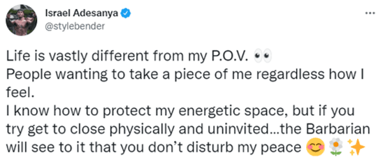 Veja o que Adesanya escreveu no Twitter: “A vida é muito diferente do meu ponto de vista. Pessoas querendo arrancar um pedaço de mim sem considerar como me sinto. Eu sei como proteger meu espaço, mas se você tentar chegar perto fisicamente e sem ser convidado, o ‘Bárbaro’ cuidará para que você não perturbe minha paz”.