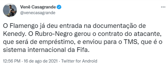 Kenedy chega por empréstimo de uma temporada, mediante o pagamento de R$ 3 milhões, que serão abatidos caso o Flamengo faça a opção de compra, que é de 10 milhões de euros (R$ 61 milhões). Ele disputou um amistoso de pré-temporada diante do Tottenham, e esteve emprestado ao Granada na temporada 2020-21.