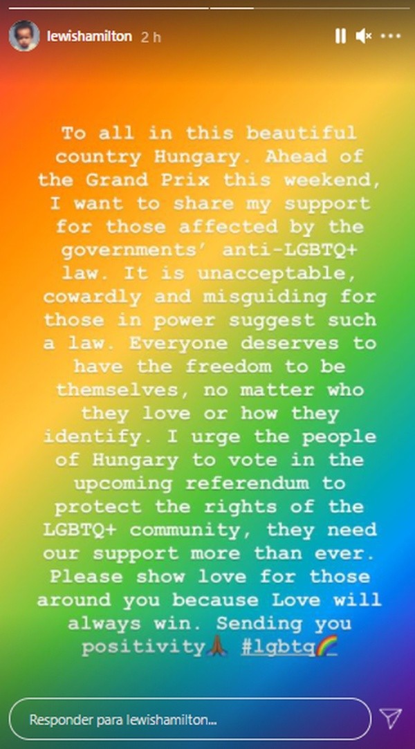 “A todos desse lindo país Hungria. Quero aproveitar o Grande Prêmio deste fim de semana para demonstrar meu apoio para quem está sendo afetado pela “lei anti-LGBTQ+” criada pelo governo. Essa proposta de lei é uma sugestão inaceitável, covarde e equivocada daqueles que estão no poder”, escreveu Hamilton.