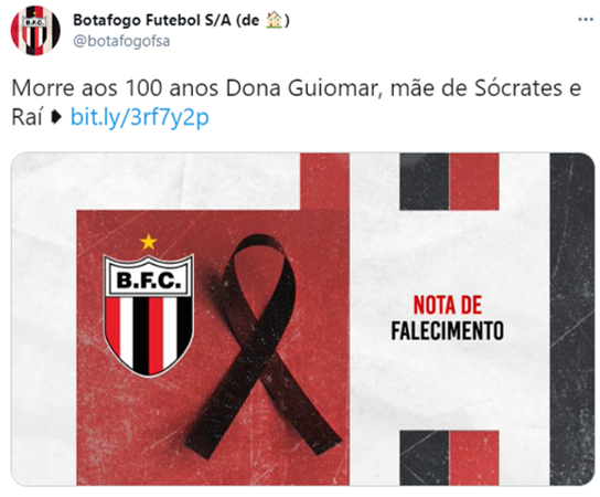 “Com imenso pesar, o Botafogo comunica o falecimento da dona Guiomar Vieira de Oliveira, a Guió, mãe de Sócrates e Raí, dois dos principais jogadores da história centenária do Tricolor. Dona Guiomar esteve presente no primeiro evento das festividades do centenário botafoguense, realizado em setembro de 2017. Completou o seu centenário em 18 de fevereiro (sic) de 2021. Dona Guiomar deixa 5 filhos, 16 netos e 7 bisnetos. A diretoria do Botafogo presta os seus mais sinceros sentimentos e condolências à família e amigos”.