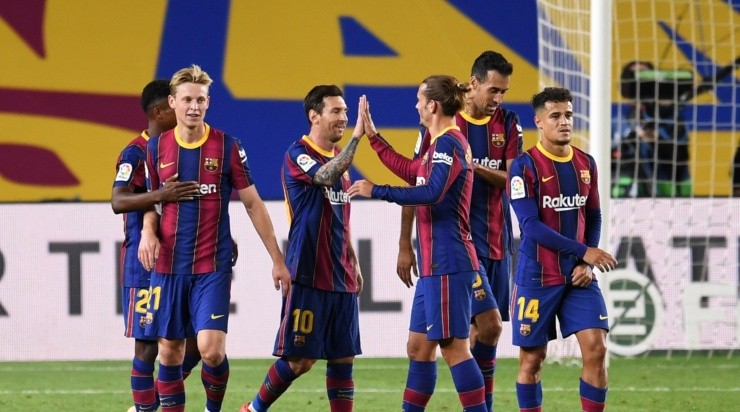 Time do Barcelona comemora gol na atual temporada (Foto: Getty Images)