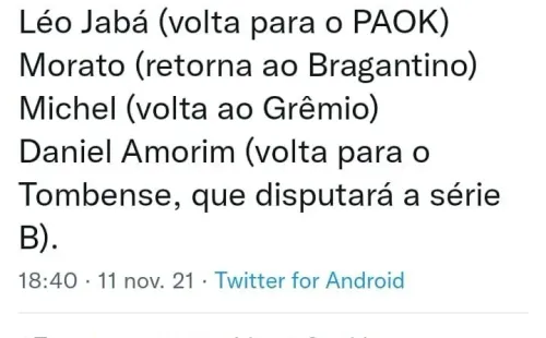 Haverá também uma grande reformação no elenco. cincojogadores já foram avisados que não irão defender o Vasco em 2022: o atacante Léo Jabá retornará ao Paok, da Grécia, Morato voltará ao RB Bragantino, Walber defenderá o Athletico e os meias Daniel e Michael serão devolvidos para a Tombense e Grêmio respectivamente. A informação é do portal PDE Vasco