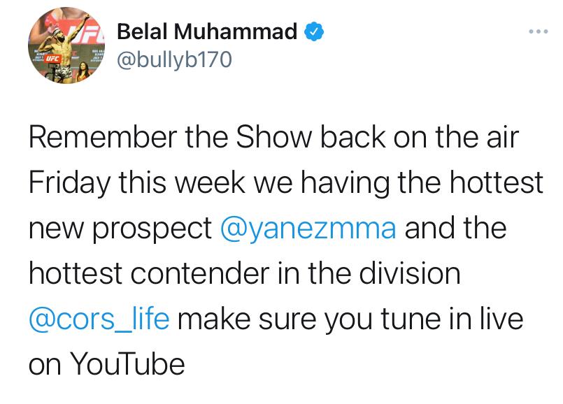 Além de querer lutar com Maia, Muhammad se coloca no card principal dos eventos da organização: “Obviamente, eu quero uma grande luta. Sinto que mereço estar no ‘main event’ por aceitar lutar em cima da hora. Um lutador que acho que seria bom disputar a luta principal comigo é Demian Maia”.