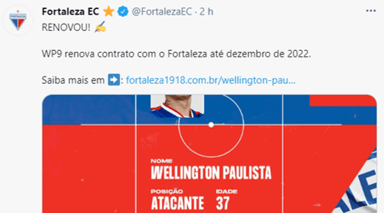 Nesta quarta-feira (7), o Fortaleza renovou o contrato do atacante Wellington Paulista, de 37 anos, por mais uma temporada e meia. Antes com vínculo até maio deste ano, o camisa 9 recebeu sondagens de outros clubes, entre eles Botafogo e Cruzeiro, por onde já havia passado ao longo da carreira.