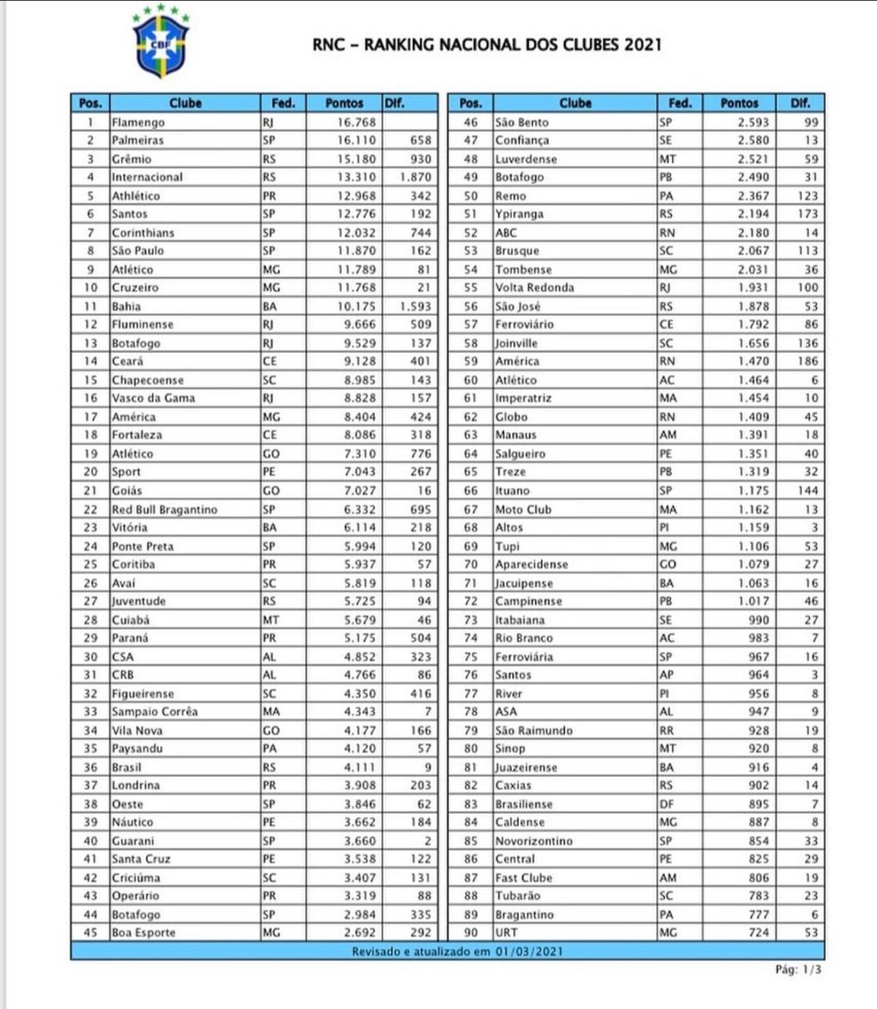 Agora, o Flamengo finalmente assumiu a ponta do ranking. A CBF explicou que um cálculo matemático é feito para todos os clubes com base no desempenho dos mesmos em competições recentes (estaduais, nacionais e internacionais).