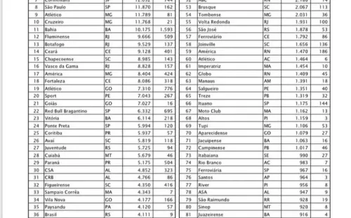 Além de Flamengo e Palmeiras, completam o Top 10: Grêmio, Internacional, Athletico-PR, Santos, Corinthians, São Paulo, Atlético-MG e Cruzeiro. O Fluminense está em 12º, enquanto o Botafogo encontra-se em 13º e o Vasco em 16º.
