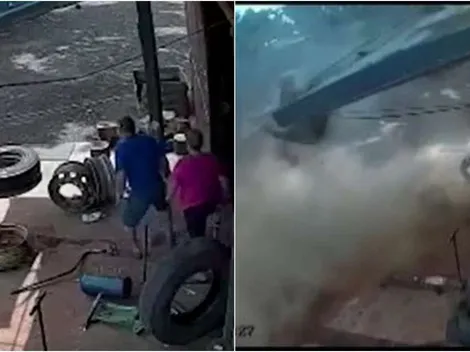 Um casal do Paraná se salvou por poucos segundos de uma tragédia em uma borracharia: um pneu estourou e causou um enorme estrondo no local.