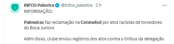 Porém, mesmo assim, a diretoria do Clube Paulista decidiu entrar com uma reclamação junto à Conmebol contra o Clube Argentino, segundo o Nosso Palestra. Isso porque, alguns torcedores dos Xeneizes mais uma vez protagonizaram episódios lamentáveis de racismo contra os palmeirenses. Algumas imagens acabaram flagrando e o Palmeiras decidiu tomar uma atitude.