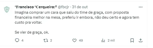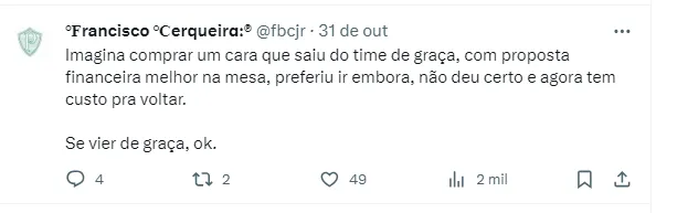 Vale lembrar que além do Palmeiras, Flamengo e São Paulo apareceram como possíveis interessados em tê-lo em 2024. O profissional informou que o segundo dos citados deve tirar o time de campo, pois estaria interessado em um empréstimo.