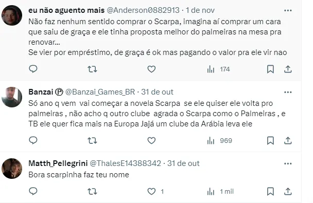 É bom frisar que de acordo com o site Transfermarkt, Scarpa está avaliado em 8 milhões de euros (R$ 42 milhões, pela cotação atual). Ele atuou pelo Verdão entre 2018 e 2022, conquistando oito títulos. Entre eles, duas Libertadores.