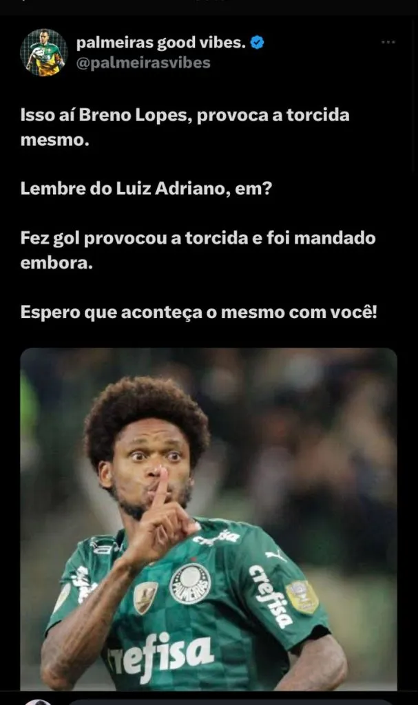 O jogador foi ‘comemorar’ em frente ao setor que fica a maior organizada do Palmeiras, a Mancha Verde, na situação ele colocou a mão no ouvido, Weverton tentou impedir, mas foi tarde demais. Na web, os torcedores pedem a rescisão de contrato de Breno Lopes: (SIC) “Muito respeito com a camisa do Palmeiras, Breno Lopes. PALHAÇO. Se liga seu otário”; “Isso aí Breno Lopes, provoca a torcida mesmo. Lembre do Luiz Adriano, em? Fez gol provocou a torcida e foi mandado embora. Espero que aconteça o mesmo com você!”, foram alguns dos comentários.