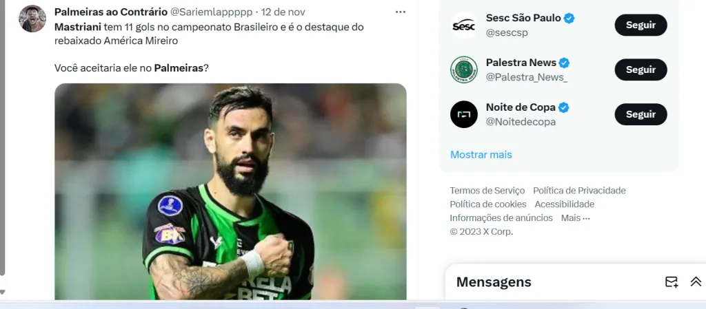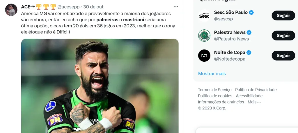 A torcida alviverde tem suas indicações nas redes sociais. Uma delas é o uruguaio Gonzalo Mastriani, artilheiro do América-MG com 21 gols no ano. O pivô de 30 anos foi o goleador da Copa Sul-Americana 2023, com nove tentos.