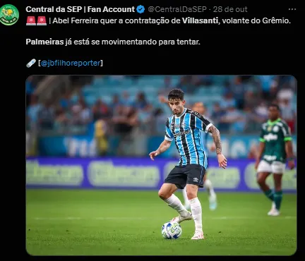 Um dos nomes que mais é especulado para reforçar o Alviverde Paulista no ano que vem é o do meio-campista paraguaio Villasanti, que pertence ao Grêmio. O time observa a situação do jogador que vem negociando seu futuro.