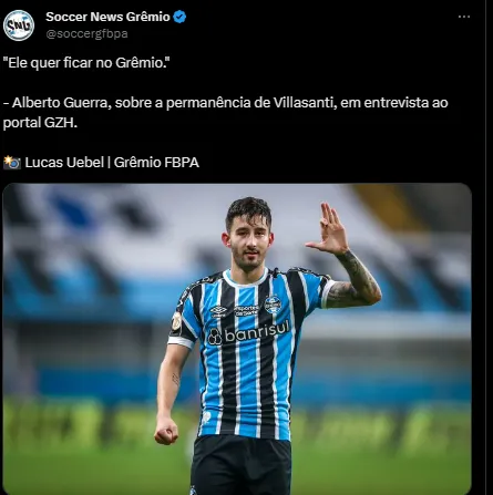 Em entrevista para a GZH, o presidente do Tricolor Gaúcho, Alberto Guerra, deixou claro que o jogador não quer sair e pretende continuar no Imortal. “Ele (Villasanti) quer jogar no Grêmio”.