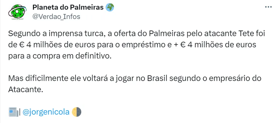 “Palmeiras ou qualquer clube que quiser contratá-lo terá que desembolsar cerca de R$ 2,5 milhões, assumindo toda tributação. O que eu ouvi de Pablo que dificilmente um clube daqui pagaria um salário tão alto. Diante desse cenário, é difícil imaginar que Tetê troque o Galatasaray por um clube brasileiro”, explicou Nicola.