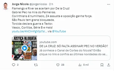 Além desses dois, conforme vídeo publicado por Nicola, em seu canal no YouTube, outros dois reforços serão procurados pelo Alviverde no mercado. Seriam eles: um atacante que atue pelos lados do campo e um zagueiro canhoto.