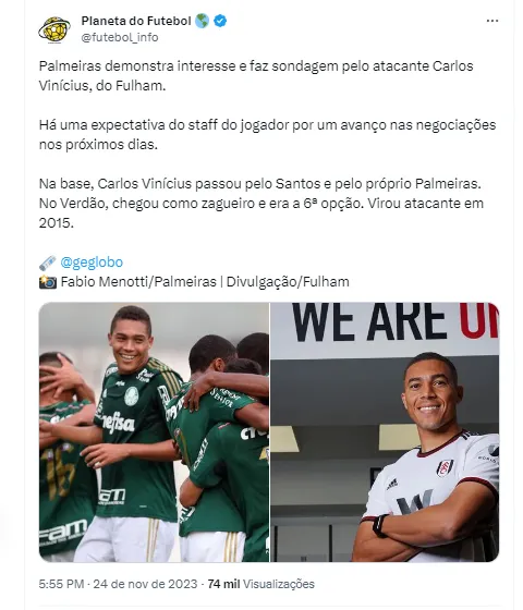 Como já publicado pelo Bolavip Brasil, o meio-campista Caio Alexandre é mais um que está bem perto de defender o Palestra em 2024. O atacante Carlos Vinícius, do Fulham, da Inglaterra, é outro que está na mira de Leila e Barros.