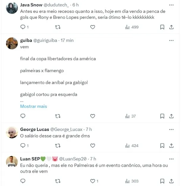 Comentários da torcida do Palmeiras aprovando Gabigol