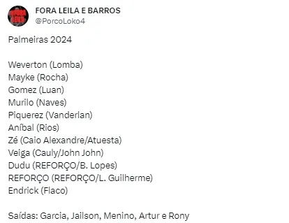 De acordo com informações trazidas pelo site Uol Esporte, uma limpa deve acontecer no elenco do Palmeiras para a temporada de 2024. Muitos jogadores que estavam emprestados e que não estão nos planos do Palestra devem sair do time.