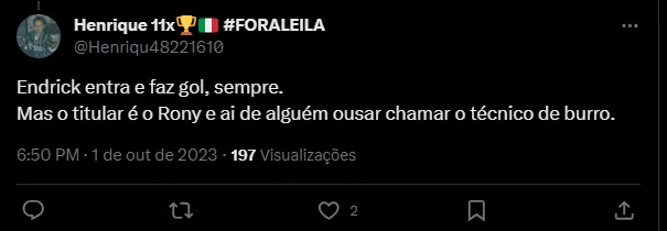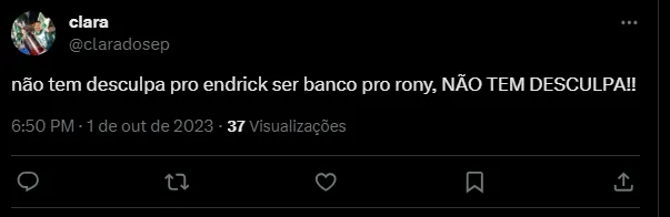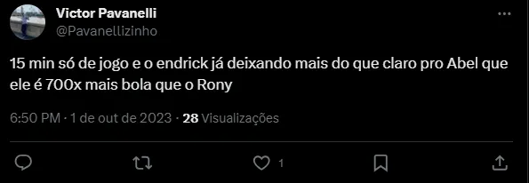 “15 minutos só de jogo e o Endrick já deixando mais do que claro pro Abel que ele é 700x mais bola que o Rony”, “Não tem desculpa pro Endrick ser banco pro Rony, NÃO TEM DESCULPA!!”, “Por mim, já tira o Endrick e o Luís Guilherme AGORA e poupa pra eles serem TITULARES contra o Boca nos lugares de Artur e Rony. São MUITO acima da média” e “Endrick entra e faz gol, sempre. Mas o titular é o Rony e ai de alguém ousar chamar o técnico de burro”, foram alguns dos comentários.