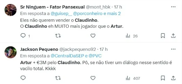 Neste momento, o Palmeiras tenta convencer o Zenit a ceder Claudinho, um dos nomes mais desejados por Maurício Galiotte na época que era presidente, mas a quantia pedida é de 25 milhões de euros (R$ 133 milhões na cotação atual), valor fora de cogitação.