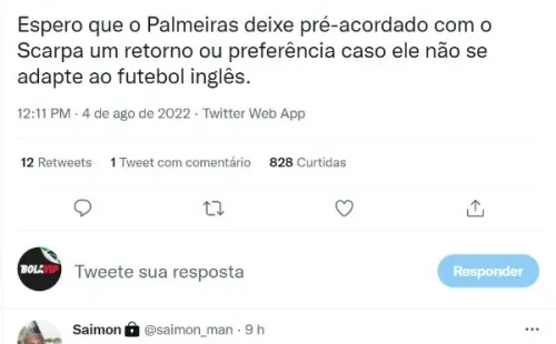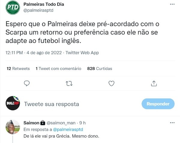 Muitos pedem que o Palmeiras deixe pré-acordado com Scarpa um retorno ou eventual preferência em caso de não adaptação na Premier League. O colega@saimon_manlembrou: “De lá ele vai para a Grécia. Mesmo dono”, informou, fazendo alusão a Marinakis.