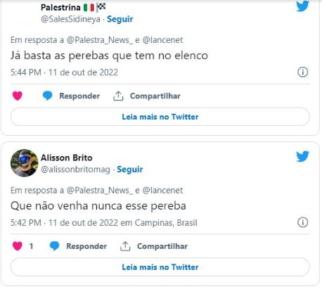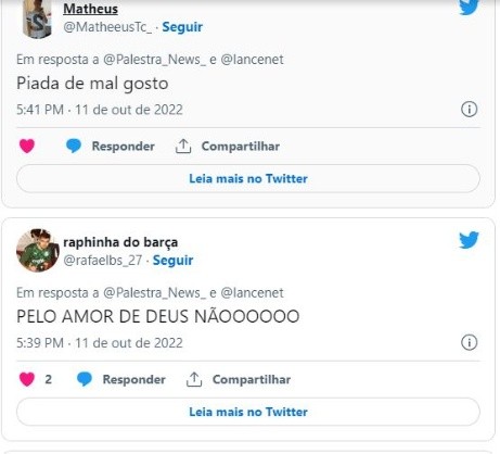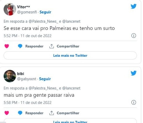E as declarações sobre uma possível chegada de Igor Gomes na Academia não foram nada amistosas e nem sequer levaram em consideração uma hipotética recuperação do futebol do jogador, caso fosse treinado pelo elenco afiado do Palestra. Confira algumas reações: