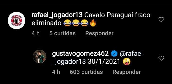 “Cavalo paraguaio eliminado”, disse o santista. Gómez imediatamente retrucou: “30/01/2021”, zoou o zagueiro, que fez uma homenagem ao bicampeonato palmeirense, que aconteceu nessa data, no Maracanã diante do Santos. Na ocasião, Breno Lopes fez o gol derradeiro.
